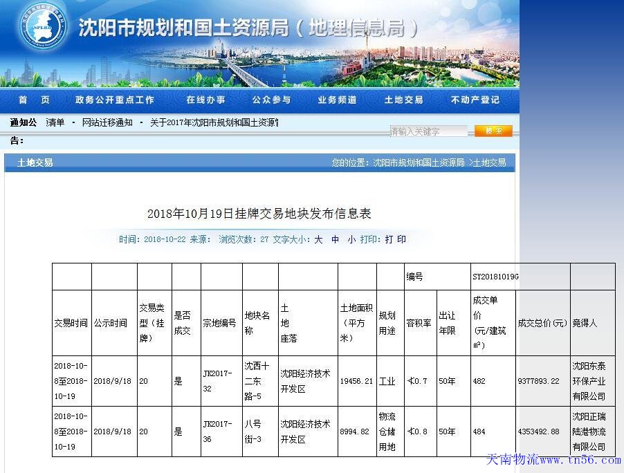 據(jù)沈陽市規(guī)劃和國土資源局10月22日公告,于今年10月8日至10月19日掛牌交易的沈西十二東路-5地塊、八號街-3地塊已成交,競得人分別為沈陽東泰環(huán)保產(chǎn)業(yè)有限公司、沈陽物流正瑞陸港物流有限公司,總面積約28.45萬平,規(guī)劃用途分別為工業(yè)用地、物流倉儲用地。